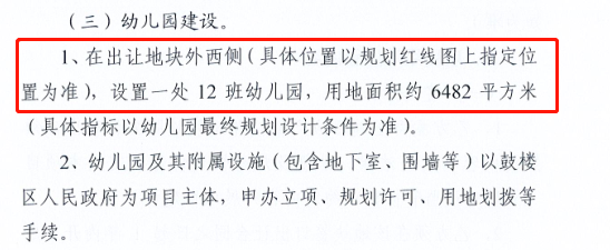 (2)在出让地块外西侧,代建一所不小于12个班的幼儿园,无偿移交给鼓楼区政府。